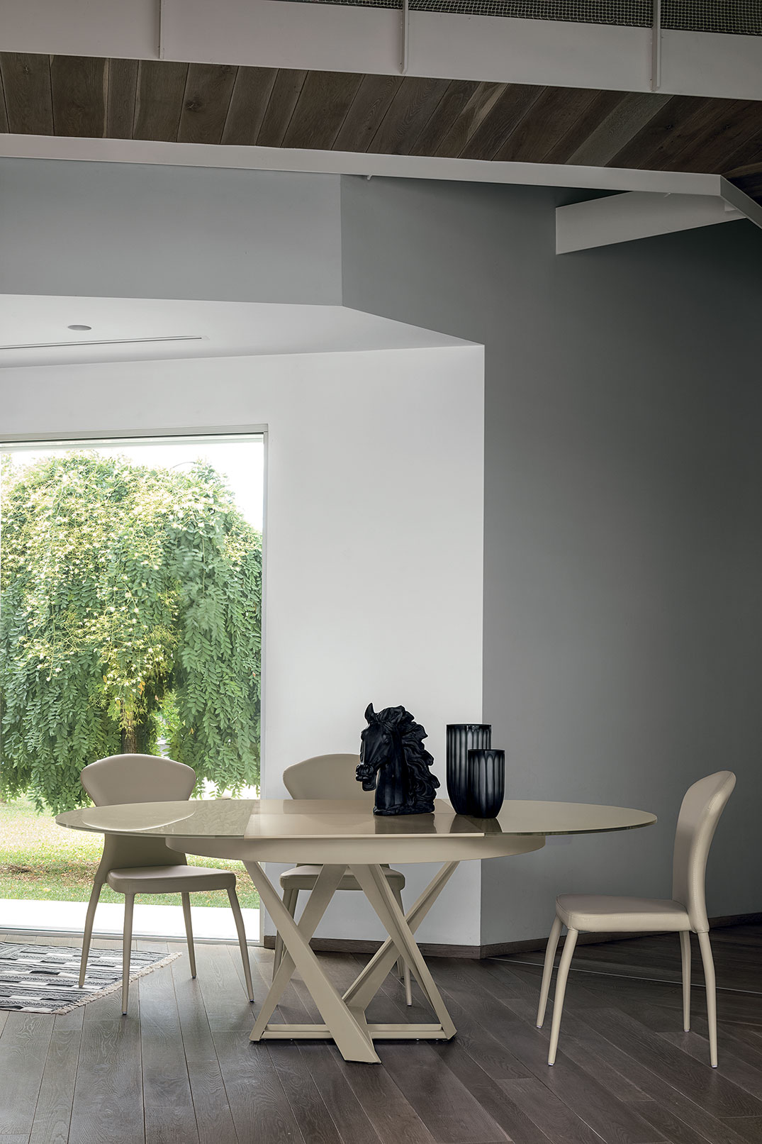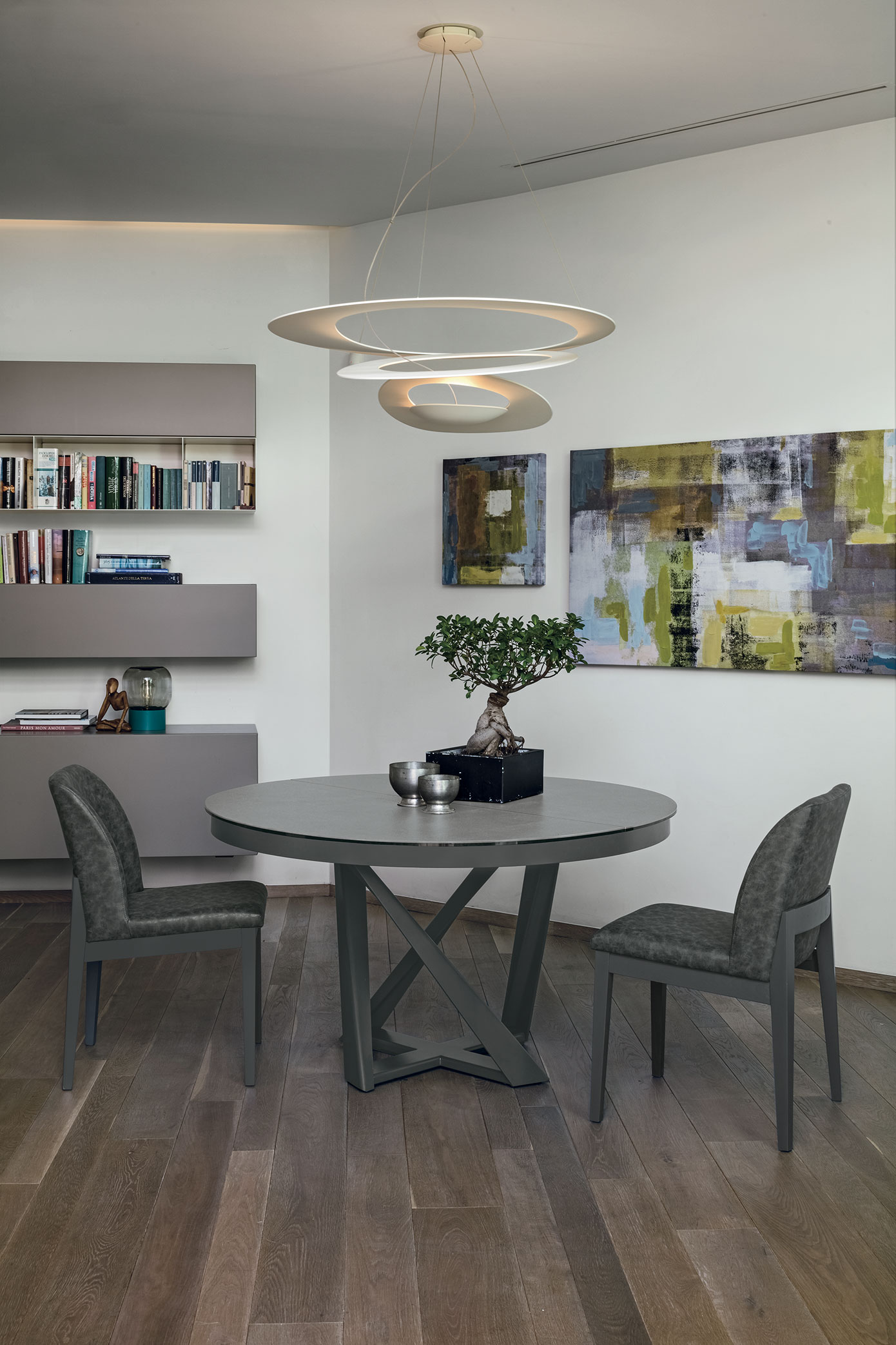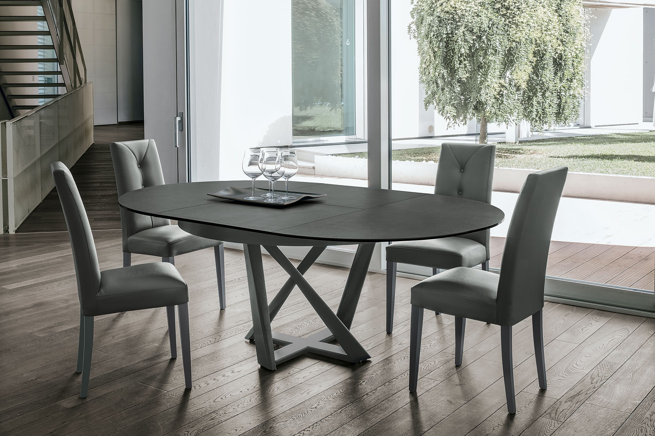 Tavolo rotondo allungabile con struttura in metallo verniciato. Piano ed allunga centrale in gres porcellanato oppure piano in vetro temperato e allunga centrale in MDF laccato in tinta con il piano.