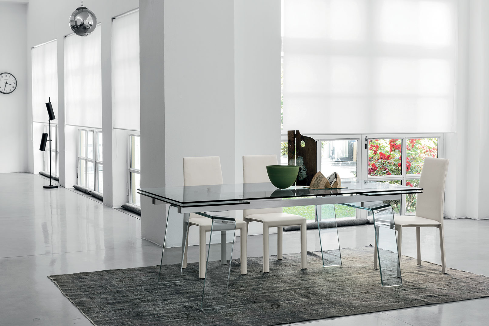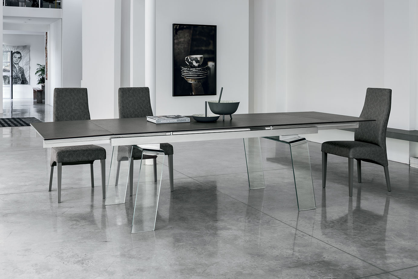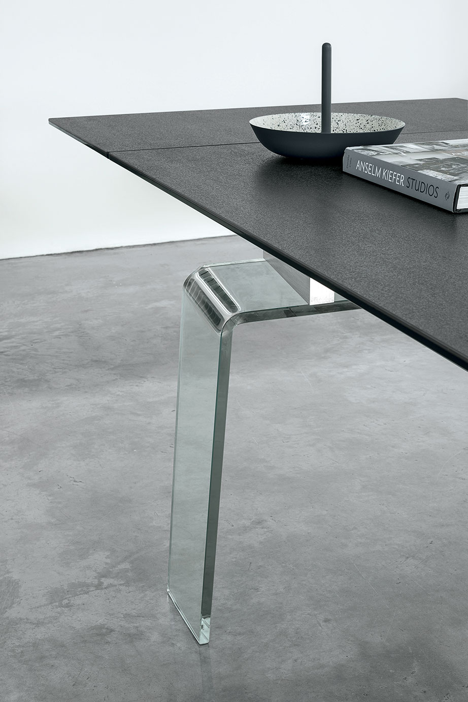 Tavolo allungabile in alluminio con gamba in vetro curvato. Piano ed allunghe laterali in gres porcellanato o vetro temperato.