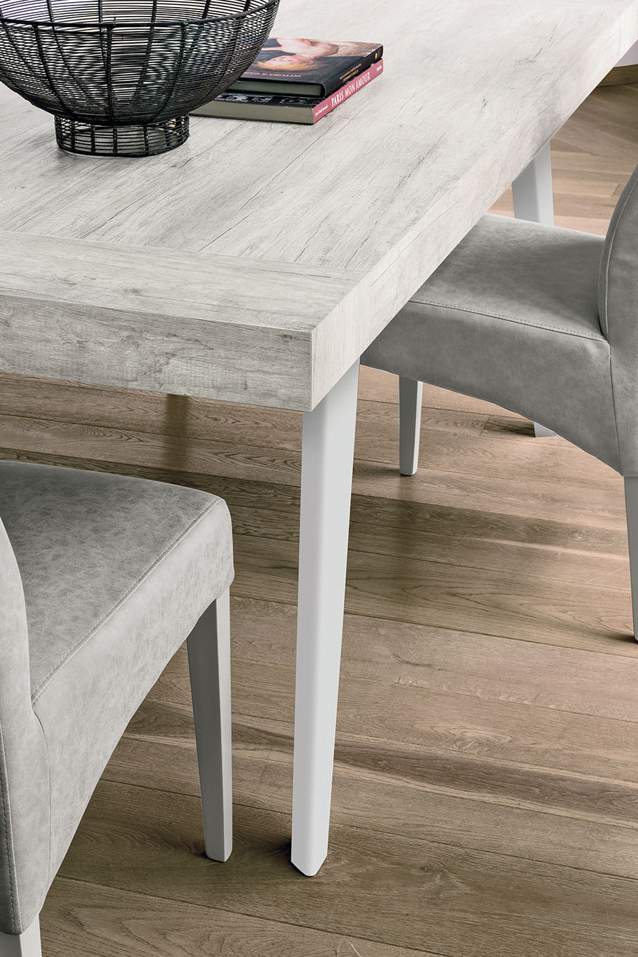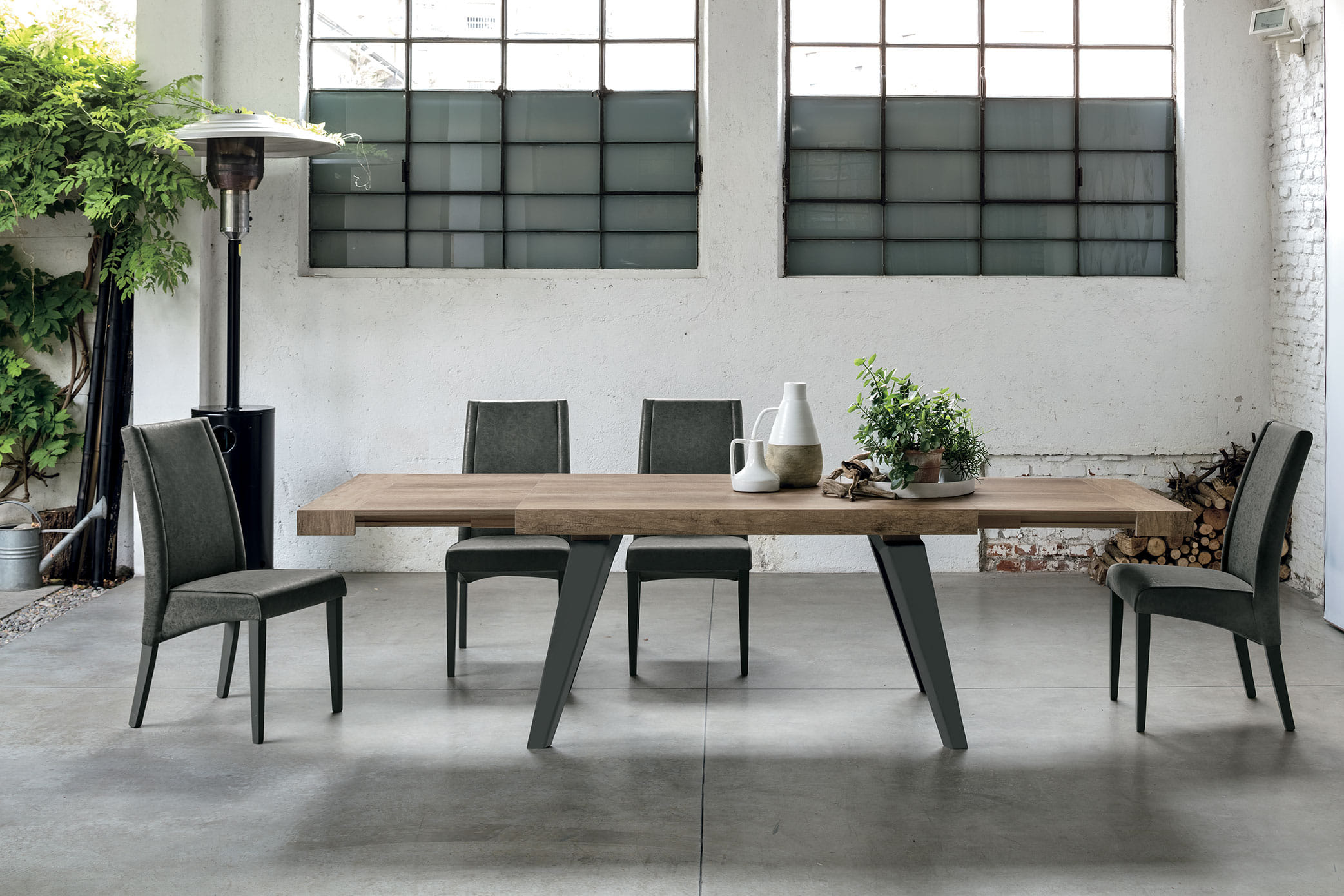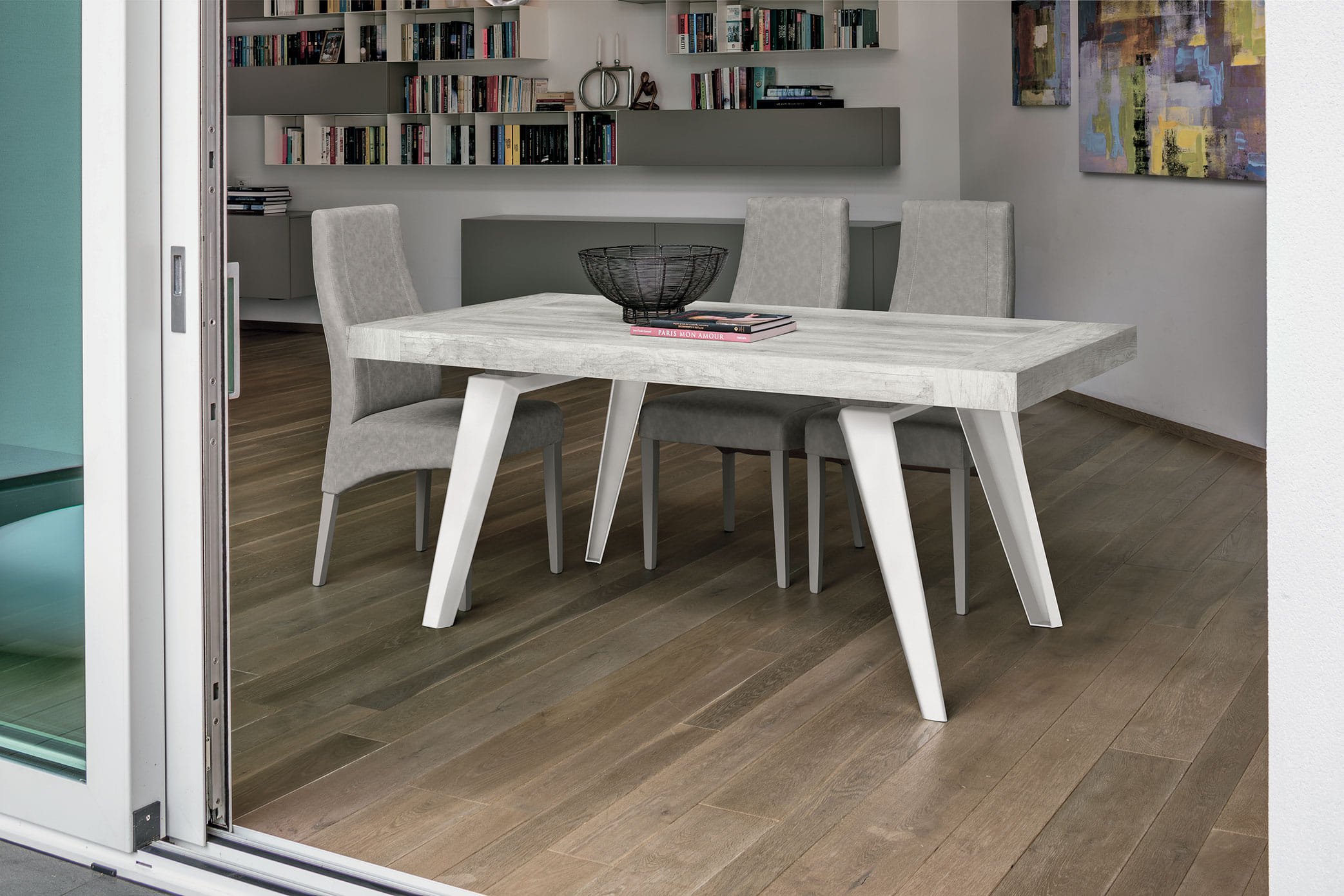 Tavolo allungabile con struttura in metallo verniciato o spazzolato. Piano ed allunghe laterali in laminato.