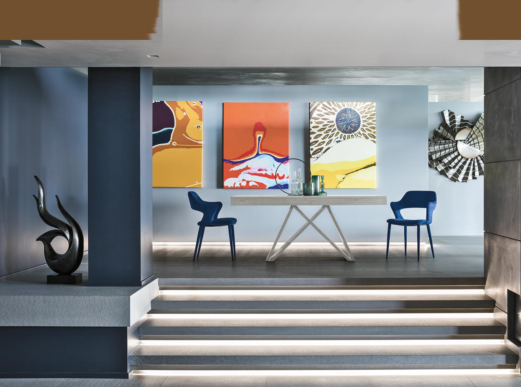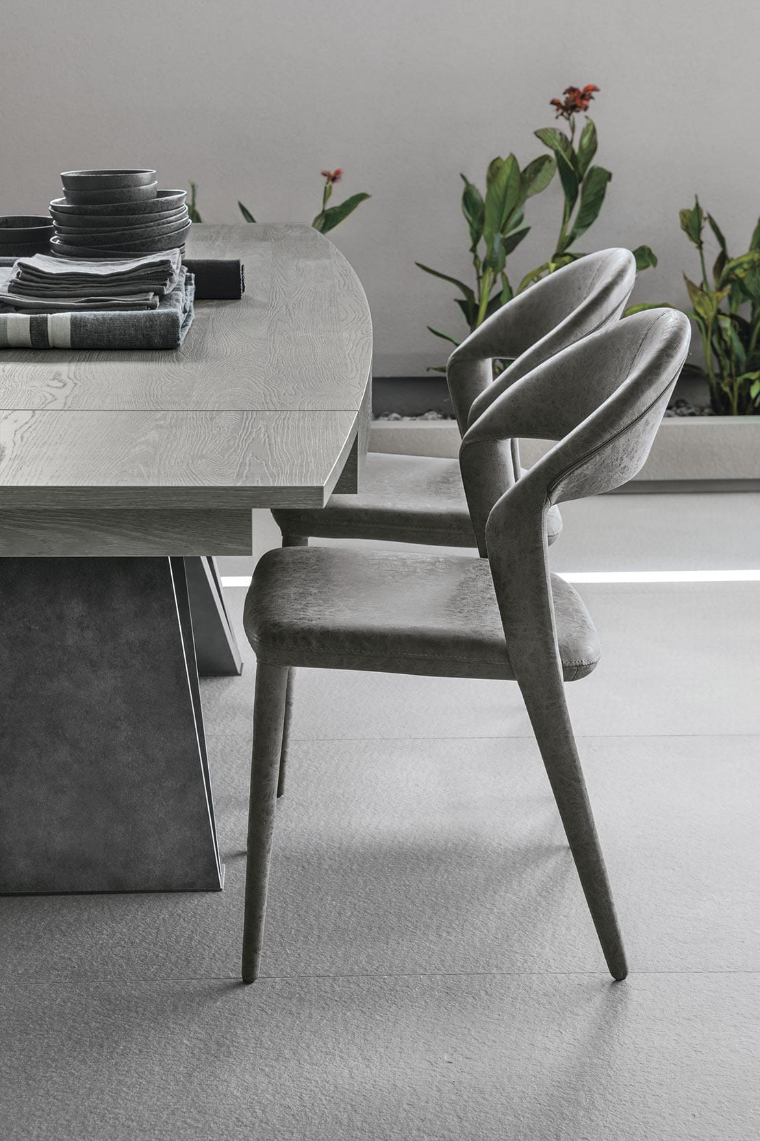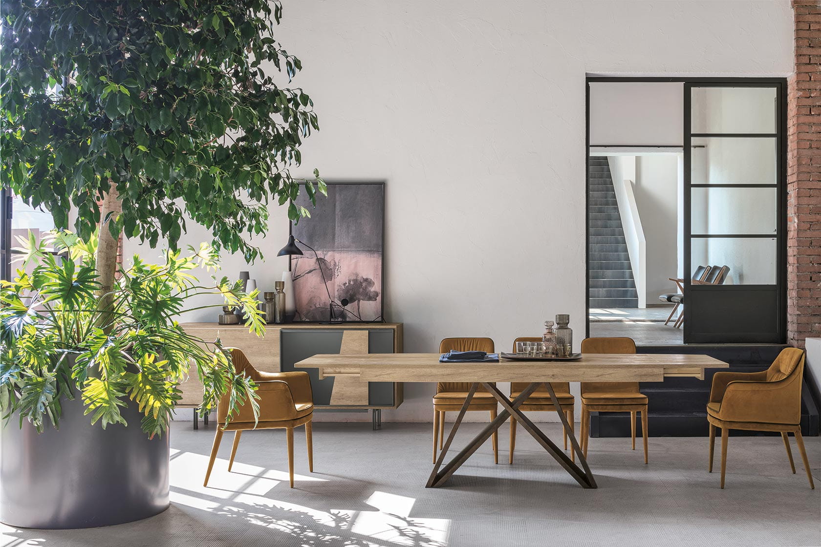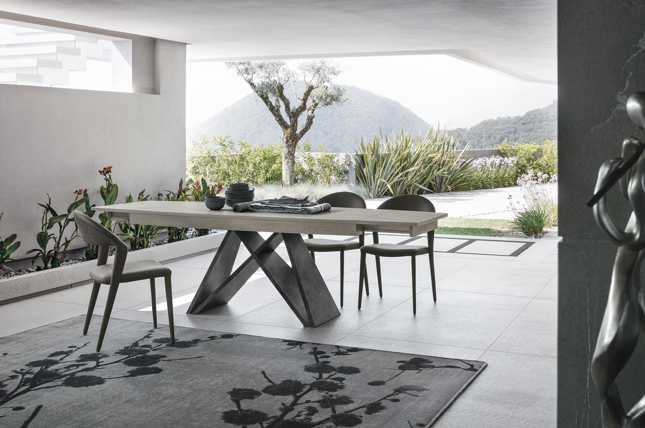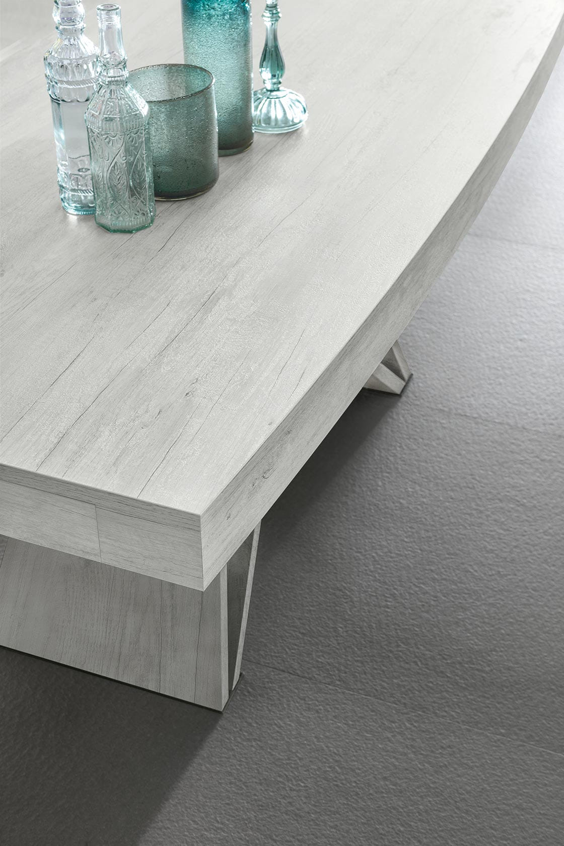 Tavolo allungabile con struttura in laminato effetto metallo. Piano ed allunghe laterali in laminato a botticella.